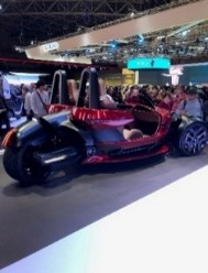また、ヤマハでは英国で1920年代に流行したスリーホイーラーの現代版、EVスリーホイーラー(前後輪操舵可能な3輪手動操舵を搭載)が参考出展されていました。